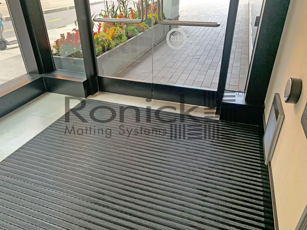 The Pedimat M2 is great for apartment complexes where winter weather is a factor; the M2 mat contains perforations to allow for dirt and moisture collection. This particular mat has a heavy-duty carpet insert that is black with gray specs to hide ice melt or salt- common in areas with heavy snowfall.